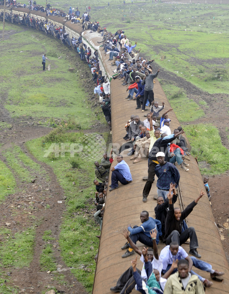写真は首都ナイロビ(Nairobi)で、定員オーバーの電車にしがみついて通勤する人々(2010年1月5日撮影)。(c)AFP/SIMON MAINA