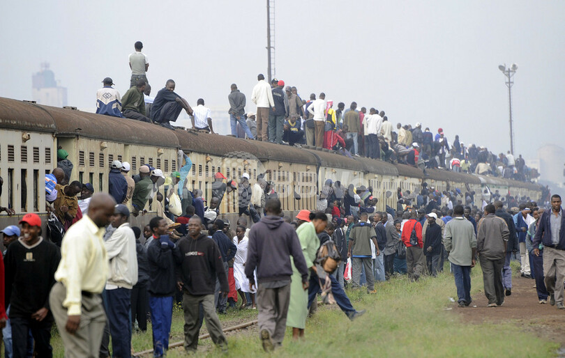 写真は首都ナイロビ(Nairobi)で、定員オーバーの電車にしがみついて通勤する人々(2010年1月5日撮影)。(c)AFP/SIMON MAINA