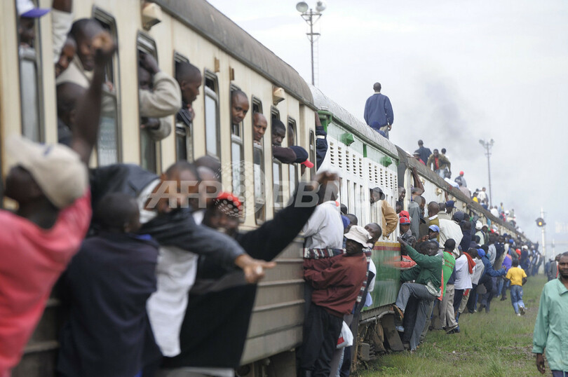 写真は首都ナイロビ(Nairobi)で、定員オーバーの電車にしがみついて通勤する人々(2010年1月5日撮影)。(c)AFP/SIMON MAINA