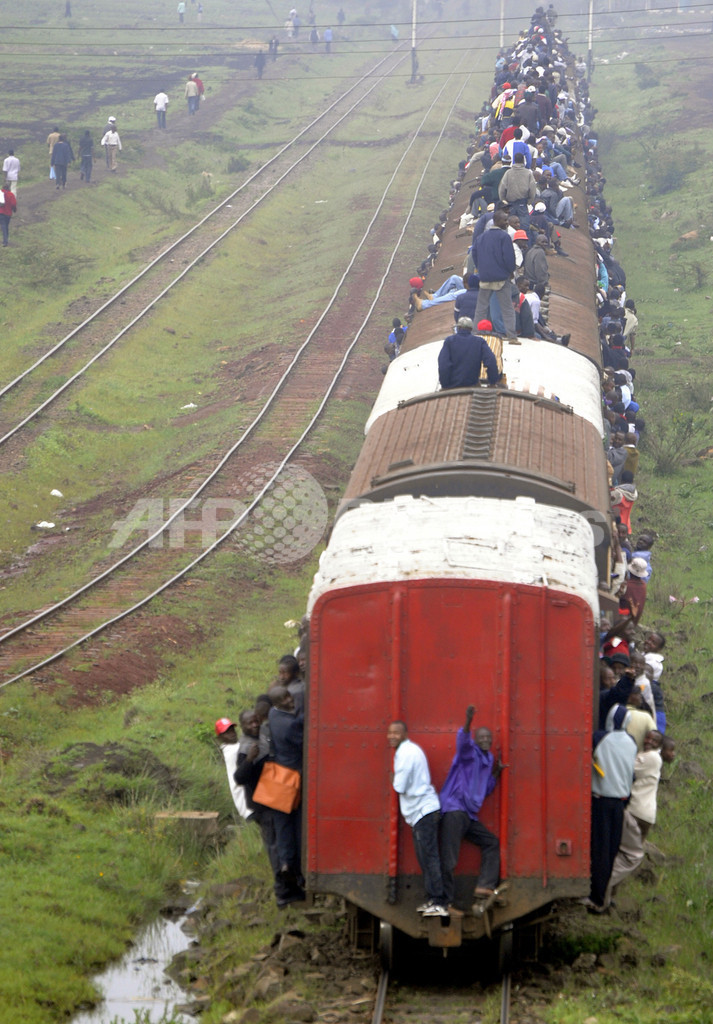 写真は首都ナイロビ(Nairobi)で、定員オーバーの電車にしがみついて通勤する人々(2010年1月5日撮影)。(c)AFP/SIMON MAINA
