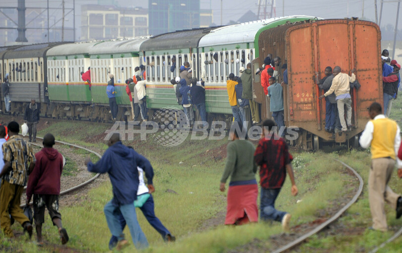 写真は首都ナイロビ(Nairobi)で、定員オーバーの電車にしがみついて通勤する人々(2010年1月5日撮影)。(c)AFP/SIMON MAINA