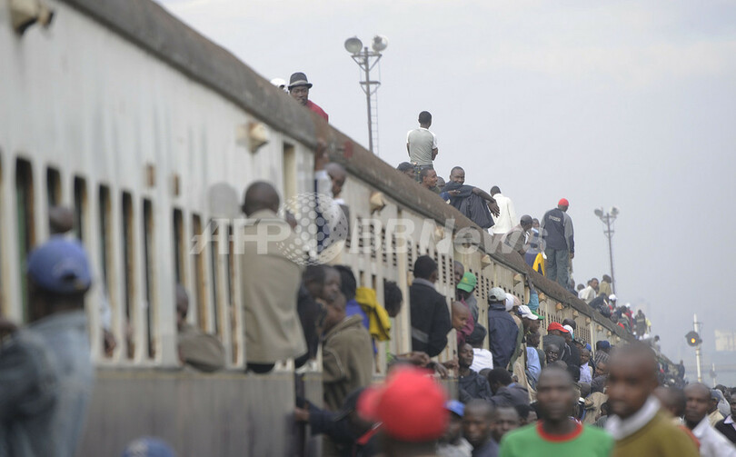 写真は首都ナイロビ(Nairobi)で、定員オーバーの電車にしがみついて通勤する人々(2010年1月5日撮影)。(c)AFP/SIMON MAINA