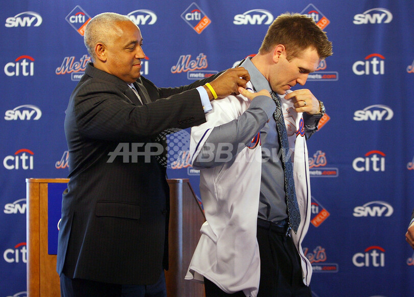 スポーツ 野球 メッツ ジェイソン・ベイの入団会見 2010年1月6日 12:50 発信地:ニューヨーク/米国 [ 北米 米国 ] このニュースをシェア ‹ › ❮ 3/7 ❯ 米メジャーリーグ(MLB)ニューヨーク・メッツ(%%New York Mets%%)に移籍したジェイソン・ベイ(%%Jason Bay%%)が5日、同球団の本拠地シティ・フィールド(Citi Field)で入団会見を行った。写真はユニホームに袖を通すジェイソン・ベイ。写真右はメッツのオマール・ミナヤ(%%Omar Minaya%%)ゼネラルマネージャー(GM)。(2010年1月5日撮影)(c)AFP/Getty Images/Mike Stobe 画像作成中 ! 【1月6日 AFP】米メジャーリーグ(MLB)ニューヨーク・メッツ(New York Mets)に移籍したジェイソン・ベイ(Jason Bay)が5日、同球団の本拠地シティ・フィールド(Citi Field)で入団会見を行った。(c)AFP/Getty Images 野球 一覧へ> メディア・報道関係・法人の方向け 写真・動画 購入のお問合せ>