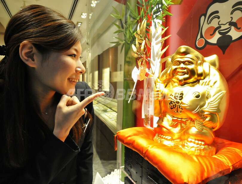 ニュース 政治・経済 こぼれ話 純金のえびす様で商売繁盛?大阪 2010年1月7日 15:47 発信地:大阪 [ アジア・オセアニア 大阪 ] このニュースをシェア ‹ › ❮ 3/4 ❯ 田中貴金属ジュエリー(Tanaka Kikinzoku Jewelry)が大阪のショールームで公開した、純金製の七福神のえびす像(2010年1月7日撮影)。(c)AFP/Yoshikazu TSUNO 画像作成中 ! 【1月7日 AFP】田中貴金属ジュエリー(Tanaka Kikinzoku Jewelry)は7日、純金で制作した七福神のえびす像を公開した。高さ40センチ、重さ15キロ。商売繁盛などを願う大阪の「十日戎」に合わせて制作したもので、価格は8000万円。(c)AFP 政治・経済 一覧へ> メディア・報道関係・法人の方向け 写真・動画 購入のお問合せ>