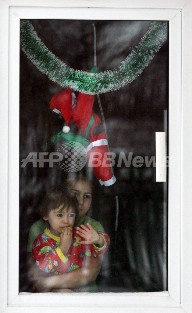 写真は、ベラルーシの首都ミンスク(Minsk)郊外の街Ozerishcheで、Koliadyの飾り付けがされた室内から外をみる親子(2010年1月7日撮影)。(c)AFP/ALEXEY GROMOV