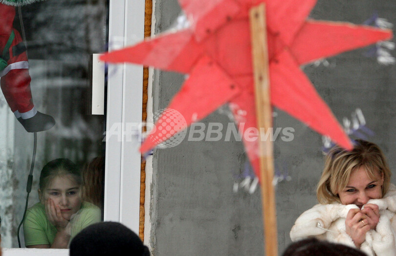 写真は、ベラルーシの首都ミンスク(Minsk)郊外の街Ozerishcheで、Koliadyの飾り付けがされた室内から外を眺める少女(2010年1月7日撮影)。(c)AFP/ALEXEY GROMOV