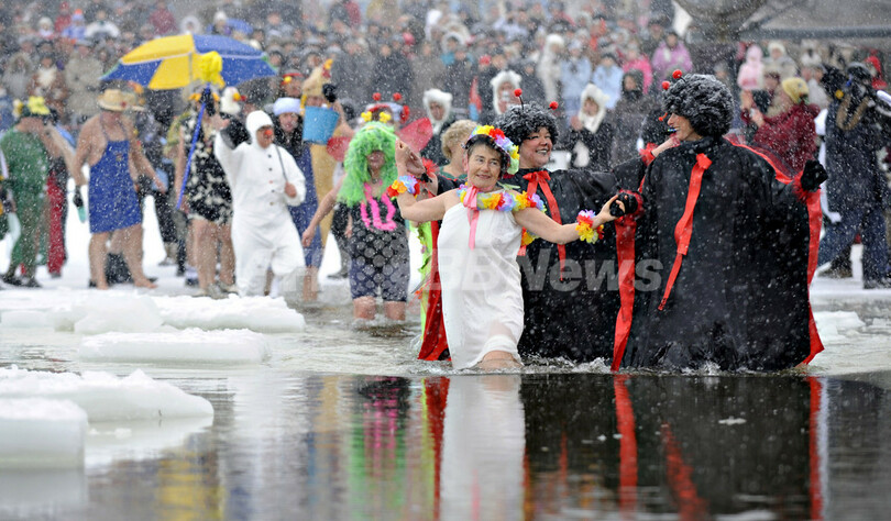 ニュース ライフ こぼれ話 ドイツで新春コスプレ寒中水泳 2010年1月10日 18:28 発信地:ベルリン/ドイツ [ ヨーロッパ ドイツ ] このニュースをシェア ‹ › ❮ 13/15 ❯ ドイツ首都ベルリン(Berlin)のオランケ湖(Orankesee)などで10日、新春恒例の寒中水泳大会が開かれ、マイナス3度の気温の中、妖精や天使、神々などの格好に扮した参加者たちが氷の張った湖に飛び込んだ。写真は寒中水泳の参加者たち(2010年1月10日撮影)。(c)AFP/DDP/AXEL SCHMIDT 画像作成中 ! 【1月10日 AFP】ドイツ首都ベルリン(Berlin)のオランケ湖(Orankesee)などで10日、新春恒例の寒中水泳大会が開かれ、マイナス3度の気温の中、妖精や天使、神々などの格好に扮した参加者たちが氷の張った湖に飛び込んだ。(c)AFP/DDP ライフ 一覧へ> メディア・報道関係・法人の方向け 写真・動画 購入のお問合せ>