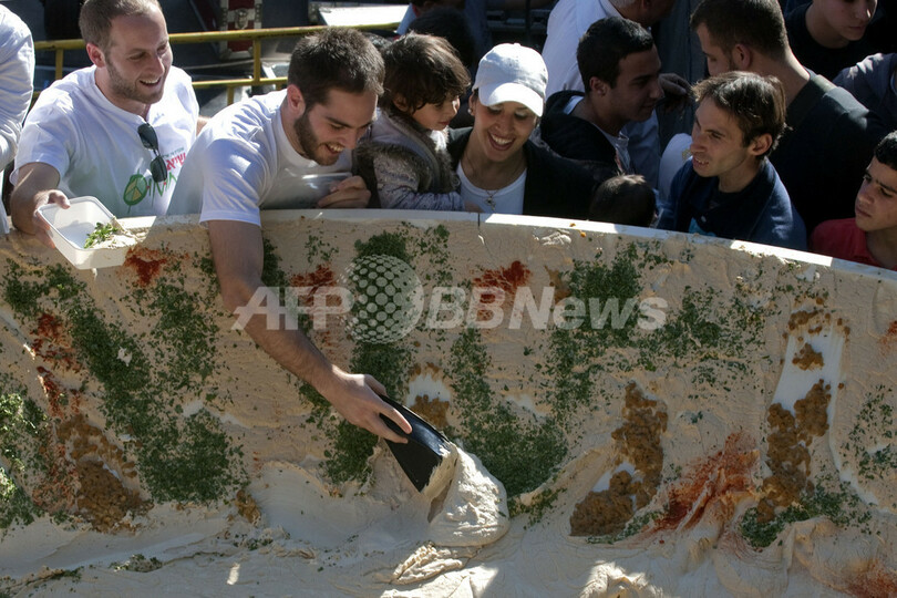【1月11日 AFP】イスラエルで8日、アラブ系イスラエル人の村アブゴッシュ(Abu Ghosh)にシェフ50人が集結し、伝統料理「フムス」(ひよこ豆のペースト)作りのギネス世界記録(Guinness Book of World Records)を達成した。出来上がったフムス4087.5キロは、後援団体らが用意した直径6メートルの衛星放送用パラボラアンテナに盛られた。
