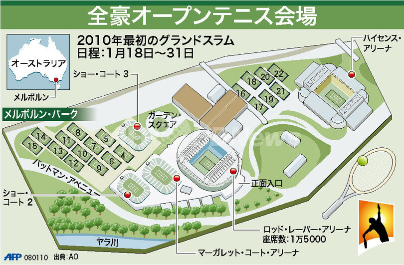 スポーツ テニス 図解 【図解】全豪オープンテニスの会場 2010年1月15日 10:14 発信地:メルボルン/オーストラリア [ アジア・オセアニア オーストラリア ] このニュースをシェア (c)AFP 【1月15日 AFP】図は、18日から31日まで開催される全豪オープンテニス(Australian Open Tennis Tournament 2010)の会場を示したもの。(c)AFP<ニュース解説画像一覧へ> テニス 一覧へ> メディア・報道関係・法人の方向け 写真・動画 購入のお問合せ>