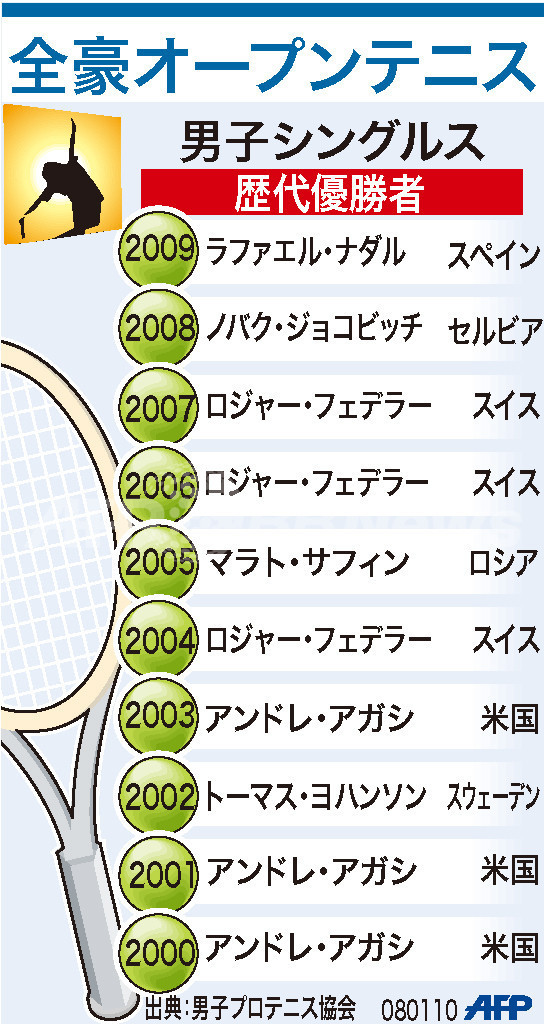 【1月15日 AFP】(写真追加、記事更新)全豪オープンテニス(Australian Open Tennis Tournament)男子シングルス、過去10年の歴代優勝者は以下の通り。