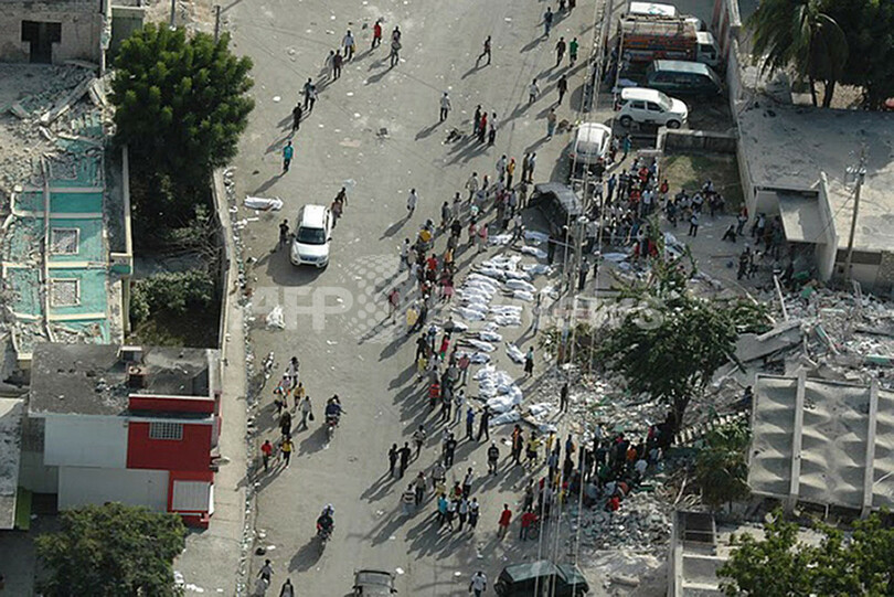 ニュース 社会 ハイチ大地震、空から見た首都ポルトープランスの被災地 2010年1月14日 23:27 発信地:ポルトープランス/ハイチ [ 中南米 ハイチ ] このニュースをシェア ‹ › ❮ 7/10 ❯ マグニチュード(M)7.0の大地震から2日が経過したハイチの首都ポルトープランス(Port-Au-Prince)で路上に並べられた遺体のまわりに集まった人びと(2010年1月14日撮影)。(c)AFP/ECHO/VICENTE RAIMUNDO 画像作成中 ! 【1月14日 AFP】マグニチュード(M)7.0の大地震から2日が経過したハイチの首都ポルトープランス(Port-Au-Prince)の被災地を空から撮影した写真が14日、公開された。同地震による死者は10万人に上るとみられ、崩壊しきった市街の路上には遺体が放置されている。家を失ったり負傷した被災者数万人は屋外で2日目の晩を過ごした。(c)AFP 社会 一覧へ> メディア・報道関係・法人の方向け 写真・動画 購入のお問合せ>