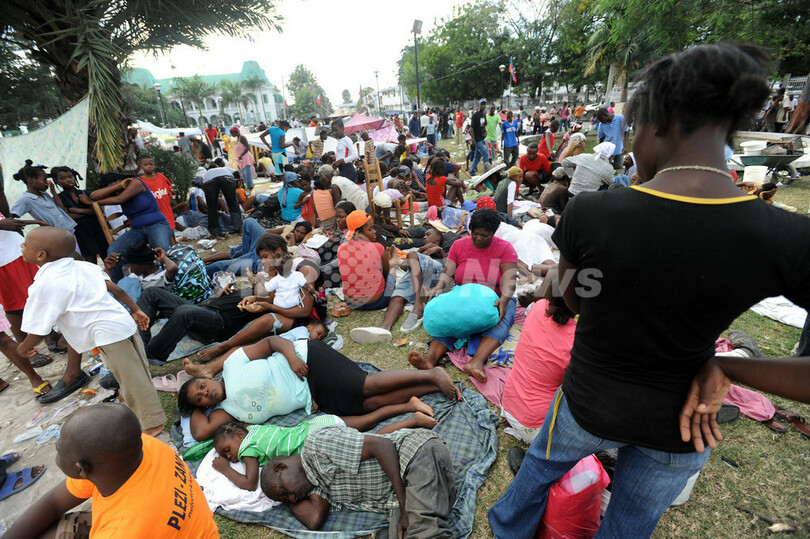 写真はハイチの首都ポルトープランス(Port-au-Prince)で、広場に避難してきた被災民ら(2010年1月13日撮影)。(c)AFP/Juan BARRETO