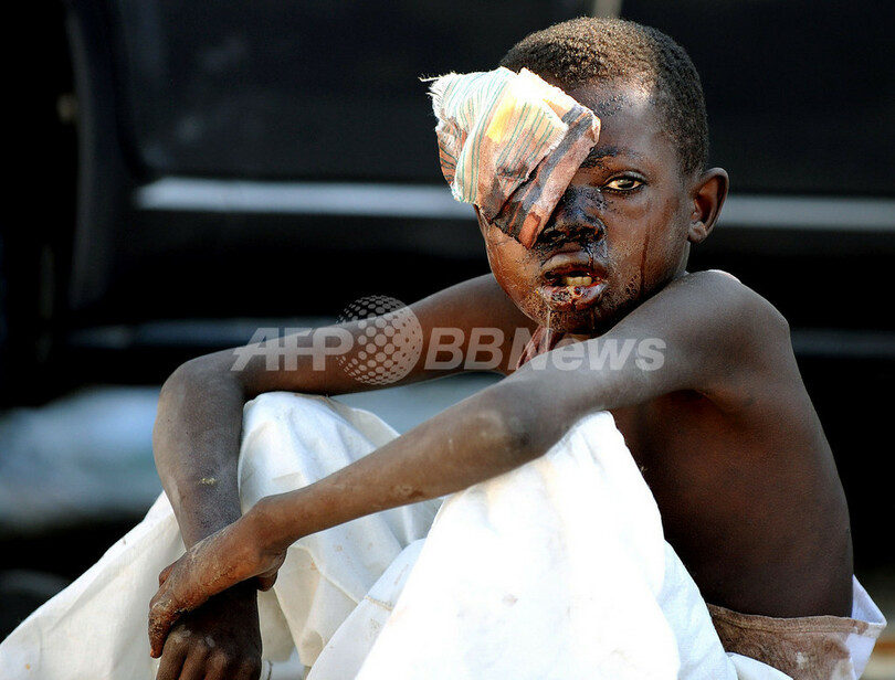 写真はハイチの首都ポルトープランス(Port-au-Prince)で、地震で負傷し病院前で治療の順番を待つ少年(2010年1月14日撮影)。(c)AFP/Juan BARRETO