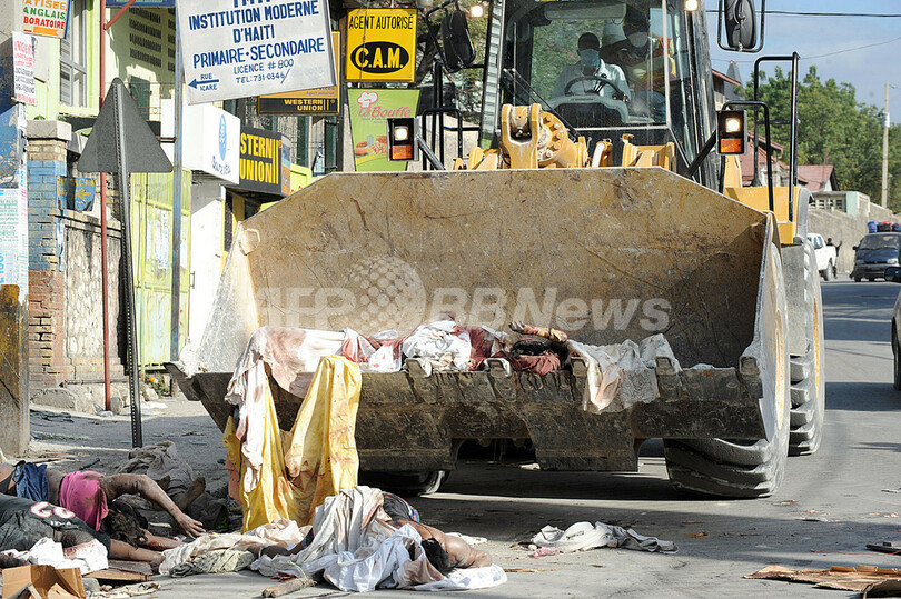 写真はハイチの首都ポルトープランス(Port-au-Prince)で、通りに放置された遺体を移動するブルドーザー(2010年1月14日撮影)。(c)AFP/Juan BARRETO