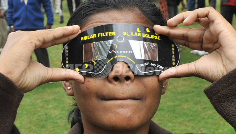 写真は、インド・ハイデラバード(Hyderabad )でサングラスをかけて「金環日食」を眺める女性(2010年1月15日撮影)。(c)AFP/Noah SEELAM
