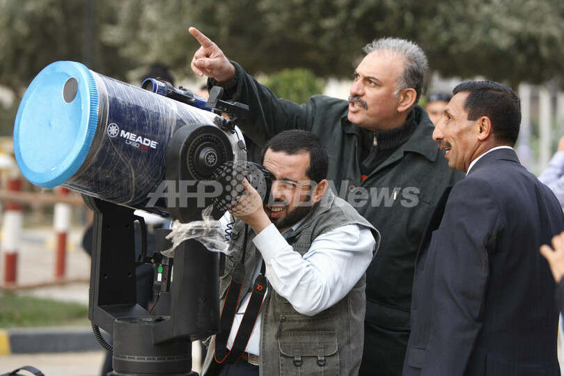 写真は、イラクの首都バグダッド(Baghdad)で「金環日食」を観測するイラク天文協会(Iraqi Astronomy Society)のメンバー(2010年1月15日撮影)。(c)AFP/AHMAD AL-RUBAYE