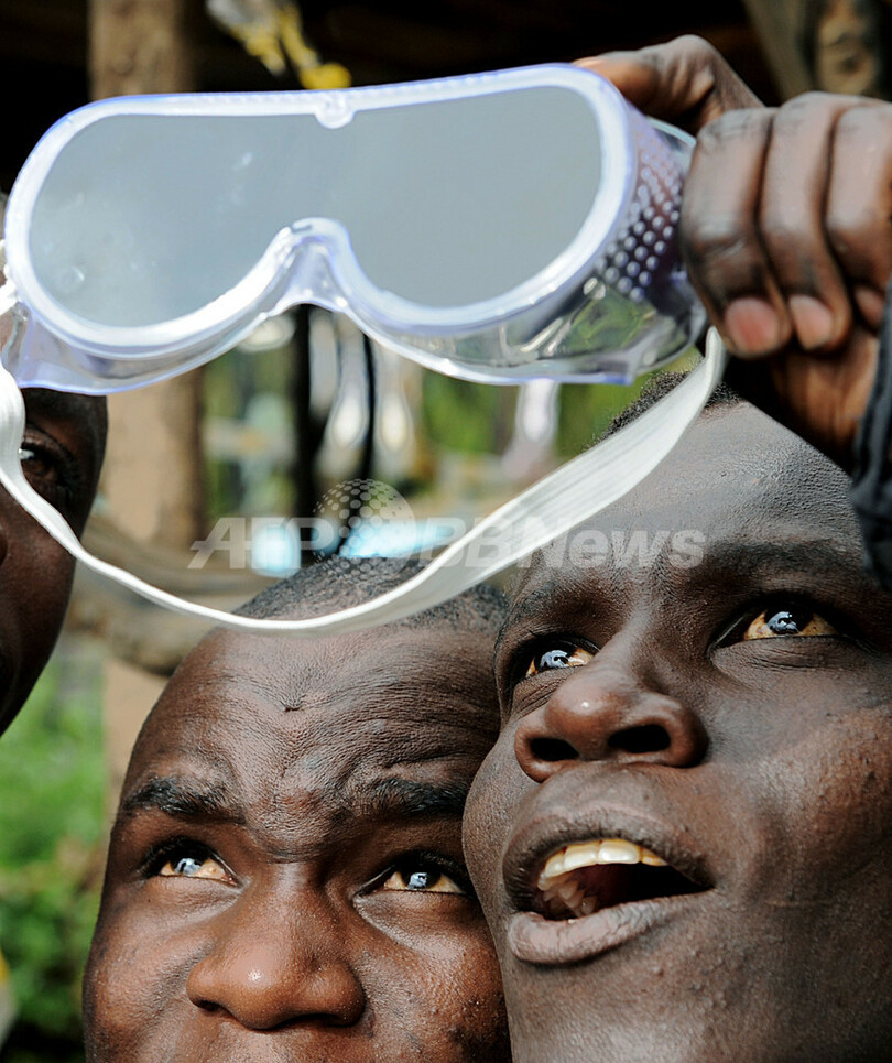 写真は、ケニアの首都ナイロビ(Nairobi)にあるスラム街キベラ(Kibera)で、ゴーグルをかざして「金環日食」を眺める住民(2010年1月15日撮影)。(c)AFP/SIMON MAINA