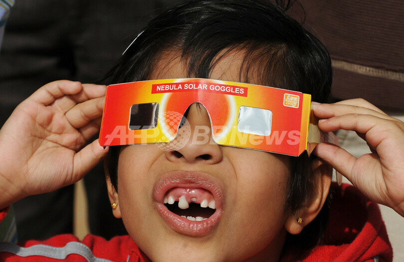 写真は、インド・バンガロール(Bangalore)で、特殊フィルムが張られたメガネを通して「金環日食」を眺める子ども(2010年1月15日撮影)。(c)AFP