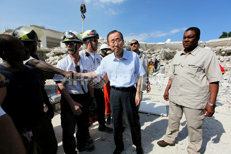 ニュース 社会 国連事務総長、ハイチ訪問 地震被害の国連機関などを視察 2010年1月18日 11:01 発信地:ポルトープランス/ハイチ [ 中南米 ハイチ ] このニュースをシェア ‹ › ❮ 9/9 ❯ 国連(UN)の潘基文(パン・キムン、Ban Ki-moon)事務総長は17日、マグニチュード(M)7.0の大地震に見舞われたハイチの首都ポルトープランス(Port-au-Prince)を訪れ、地震の被害を受けた国連ハイチ安定化ミッション(MINUSTAH)本部などを視察した。写真は、MINUSTAH本部を視察し、米国の救助隊員と握手を交わす潘事務総長(中央、2010年1月17日撮影)。(c)AFP/THOMAS COEX 画像作成中 ! 【1月18日 AFP】国連(UN)の潘基文(パン・キムン、Ban Ki-moon)事務総長は17日、マグニチュード(M)7.0の大地震に見舞われたハイチの首都ポルトープランス(Port-au-Prince)を訪れ、地震の被害を受けた国連ハイチ安定化ミッション(MINUSTAH)本部などを視察した。(c)AFP 社会 一覧へ> メディア・報道関係・法人の方向け 写真・動画 購入のお問合せ>