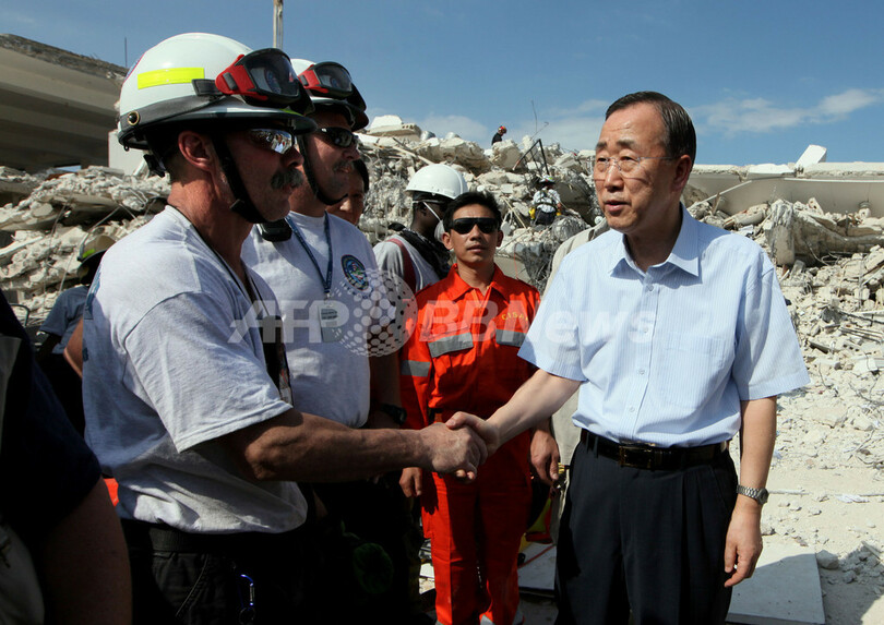 ニュース 社会 国連事務総長、ハイチ訪問 地震被害の国連機関などを視察 2010年1月18日 11:01 発信地:ポルトープランス/ハイチ [ 中南米 ハイチ ] このニュースをシェア ‹ › ❮ 8/9 ❯ 国連(UN)の潘基文(パン・キムン、Ban Ki-moon)事務総長は17日、マグニチュード(M)7.0の大地震に見舞われたハイチの首都ポルトープランス(Port-au-Prince)を訪れ、地震の被害を受けた国連ハイチ安定化ミッション(MINUSTAH)本部などを視察した。写真は、MINUSTAH本部を視察し、米国の救助隊員と握手を交わす潘事務総長(右、2010年1月17日撮影)。(c)AFP/THOMAS COEX 画像作成中 ! 【1月18日 AFP】国連(UN)の潘基文(パン・キムン、Ban Ki-moon)事務総長は17日、マグニチュード(M)7.0の大地震に見舞われたハイチの首都ポルトープランス(Port-au-Prince)を訪れ、地震の被害を受けた国連ハイチ安定化ミッション(MINUSTAH)本部などを視察した。(c)AFP 社会 一覧へ> メディア・報道関係・法人の方向け 写真・動画 購入のお問合せ>