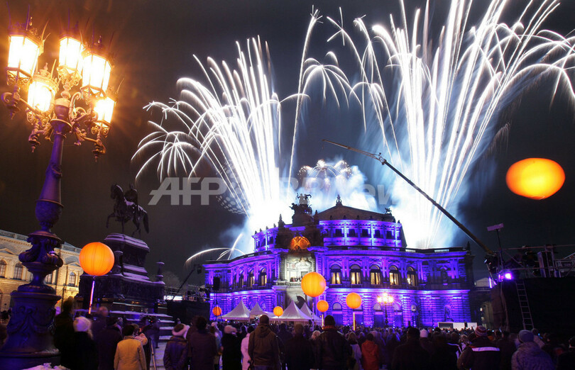 写真は、「ゼンパーオーパー」の舞踏会「Semper opera ball」開会式で打ち上げられる花火(2010年1月15日撮影)。(c)AFP/DDP/UWE MEINHOLD
