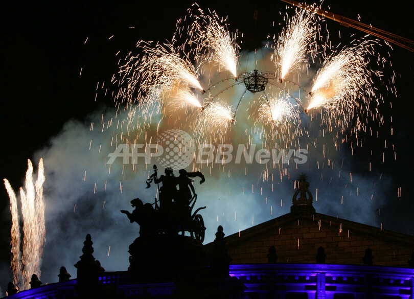 写真は、「ゼンパーオーパー」の舞踏会「Semper opera ball」開会式で打ち上げられる花火(2010年1月15日撮影)。(c)AFP/DDP/UWE MEINHOLD