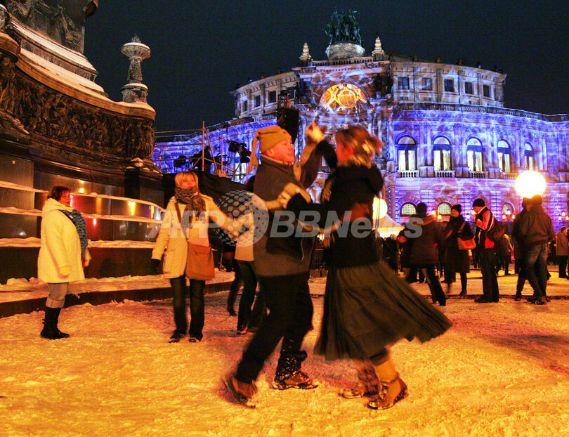 写真は、「ゼンパーオーパー」前の雪の上で踊る人々(2010年1月15日撮影)。(c)AFP/DDP/UWE MEINHOLD