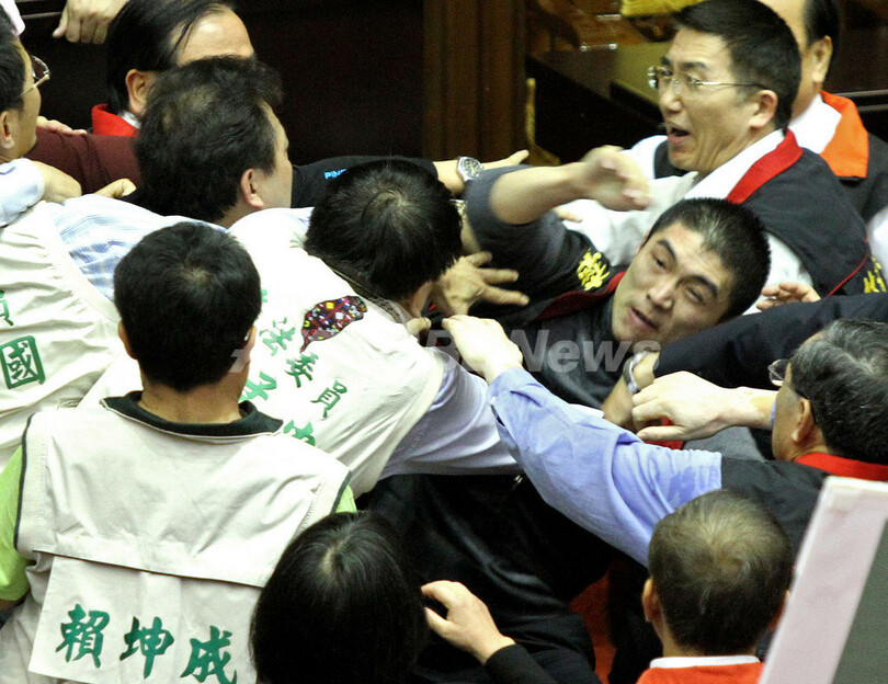ニュース 政治・経済 台湾・立法院で乱闘騒ぎ 2010年1月19日 15:56 発信地:台北/台湾 [ 中国・台湾 台湾 ] このニュースをシェア ‹ › ❮ 2/2 ❯ 台湾・台北(Taipei)の立法院(国会)で、つかみ合いの乱闘を繰り広げる与党国民党(Kuomintang Party)と野党民主進歩党(Democratic Progressive Party)の議員(2010年1月18日撮影)。(c)AFP 画像作成中 ! 【1月19日】台湾・台北(Taipei)の立法院(国会)で行われていた臨時議会で18日、物議をかもしていた地方行政改正法案の議員投票前に、与党国民党(Kuomintang Pary)と野党民主進歩党(Democratic Progressive Party)の議員の間で乱闘騒ぎが起きた。(c)AFP 政治・経済 一覧へ> メディア・報道関係・法人の方向け 写真・動画 購入のお問合せ>