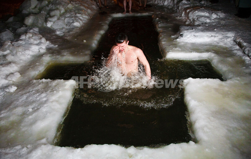 モスクワ郊外のゴルフクラブでは、19日午前零時(日本時間同日午前6時)を過ぎると、集まった人々がマイナス25度の寒さの中、氷にあけた穴から水に飛び込んだ。