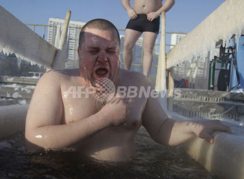 モスクワ郊外のゴルフクラブでは、19日午前零時(日本時間同日午前6時)を過ぎると、集まった人々がマイナス25度の寒さの中、氷にあけた穴から水に飛び込んだ。