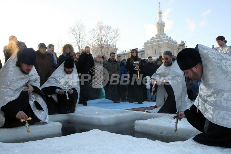 ロシア通信(RIA-Novosti)が警察の情報として報じたところによると、モスクワ(Moscow)では約3万人が19日の未明から朝にかけて、湖や川にはった氷に穴をあけて水に浸かった。ロシア非常事態省はモスクワ近辺の湖と川に200人のライフガードを配置した。