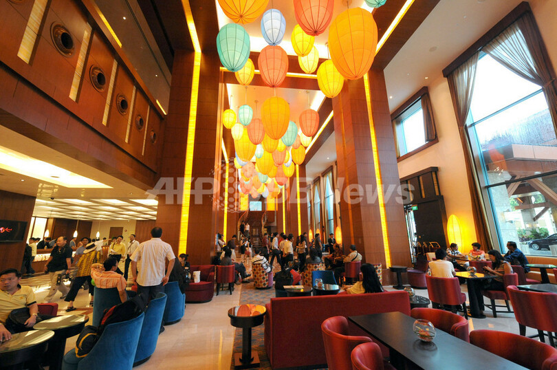 写真は、シンガポールの複合リゾート「リゾーツ・ワールド・セントーサ」内にある高級ホテル「フェスティブ(Festive)」のロビー(2010年1月20日撮影)。(c)AFP/ROSLAN RAHMAN
