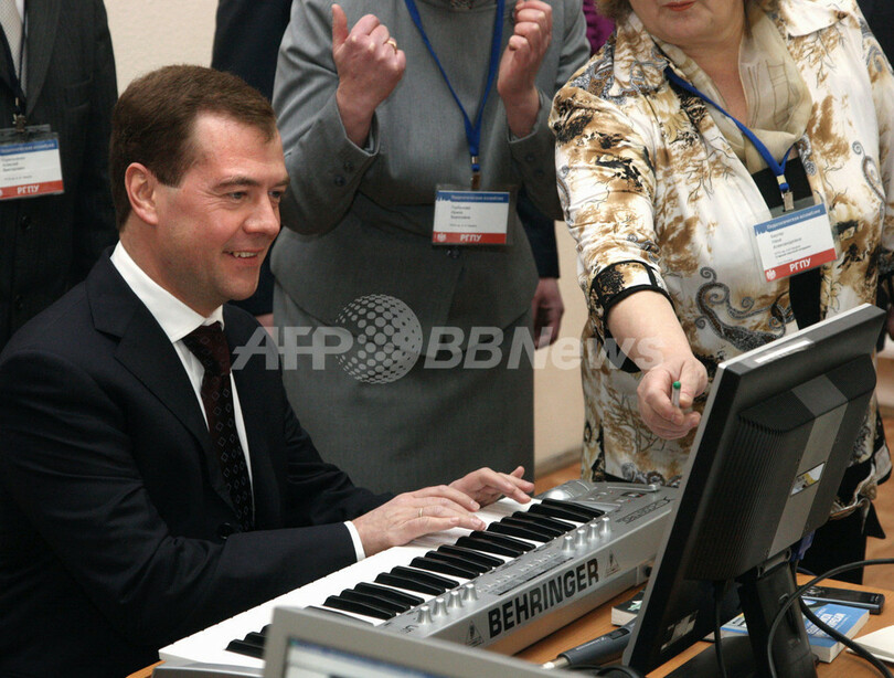 サンクトペテルブルク(Saint Petersburg)にある国立教育大学を視察したメドベージェフ大統領は、講師が使う電子ピアノの前に緊張した面持ちで座った。