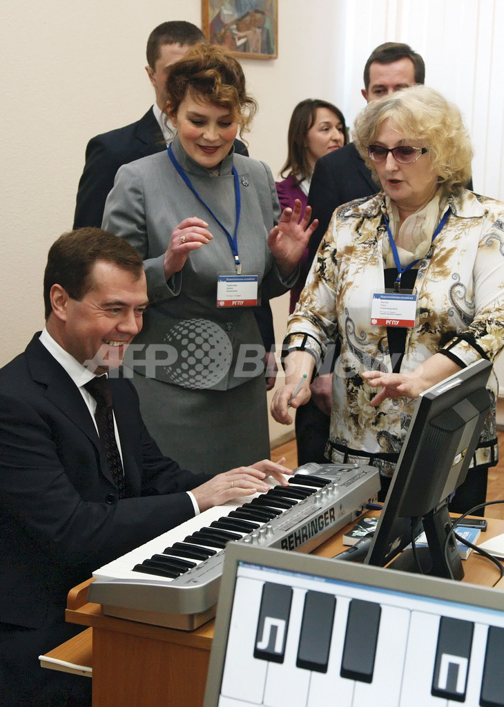 サンクトペテルブルク(Saint Petersburg)にある国立教育大学を視察したメドベージェフ大統領は、講師が使う電子ピアノの前に緊張した面持ちで座った。