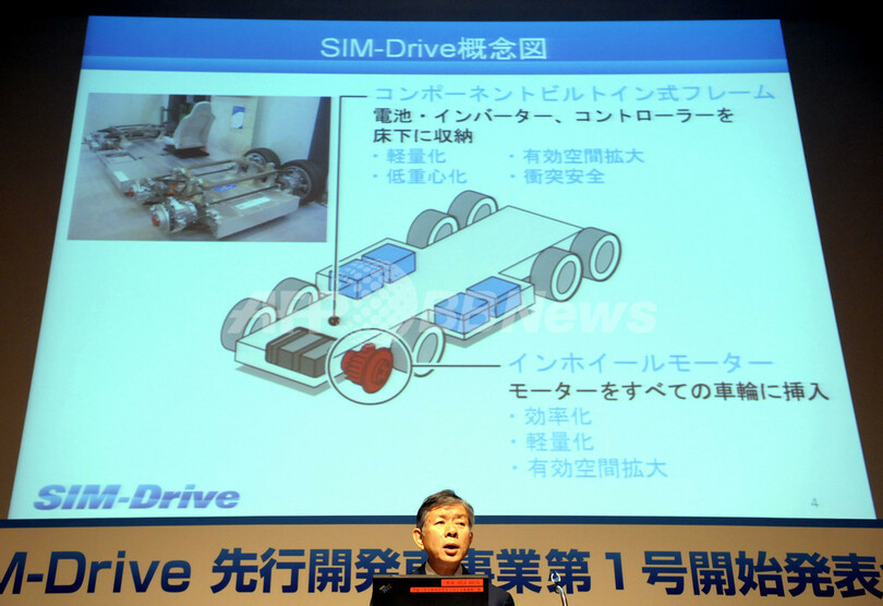 【1月22日 AFP】産学連携の電気自動車(EV)ベンチャー企業「シムドライブ(SIM-Drive)」は22日、34の企業・自治体と共同でEV試作車を開発すると発表した。試作車の開発には、車輪にモーターを組み込む同社特有の「インホイールモーター」技術や、車体のフレームに主要部品を挿入する「コンポーネントビルトイン式フレーム」技術を用いる。「シムドライブ」は慶応義塾大学(Keio University)を中心とした産学連携ベンチャー。(c)AFP