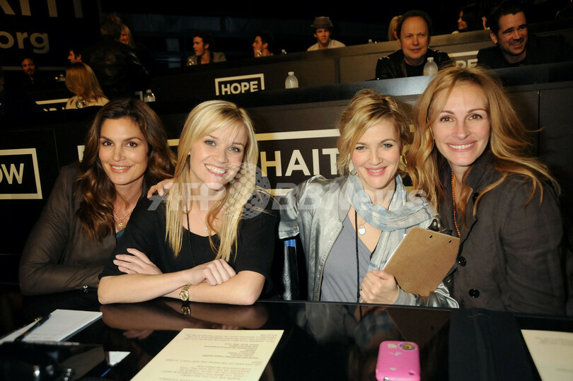 ハイチ大地震で被災した人たちの支援を目的とする寄付金集めのためのテレビ番組「ホープ・フォー・ハイチ・ナウ(Hope For Haiti Now)」が22日、米音楽情報チャンネルMTVで生放送された。俳優ジョージ・クルーニー(George Clooney)が司会を務め、多くのスターが電話で募金を受け付けた。写真は、番組に参加した(左から)モデルのシンディ・クロフォード(Cindy Crawford)、女優のリース・ウィザースプーン(Reese Witherspoon)、ドリュー・バリモア(Drew Barrymore)、ジュリア・ロバーツ(Julia Roberts、2010年1月22日撮影)。(c)AFP/MTV Hope for Haiti Now/Jeff Kravitz