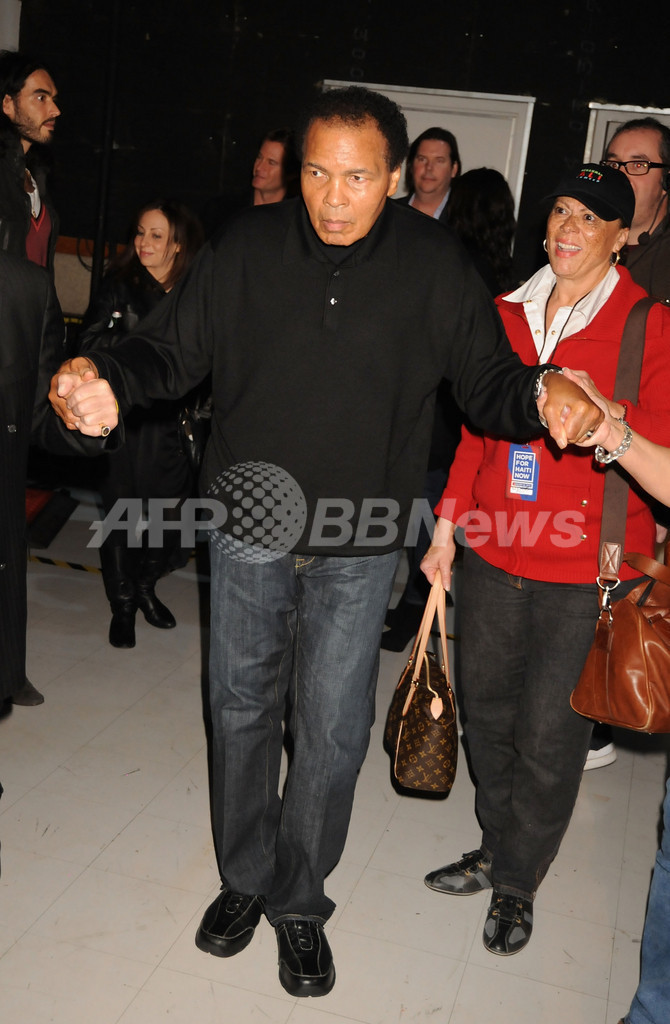 ハイチ大地震で被災した人たちの支援を目的とする寄付金集めのためのテレビ番組「ホープ・フォー・ハイチ・ナウ(Hope For Haiti Now)」が22日、米音楽情報チャンネルMTVで生放送された。俳優ジョージ・クルーニー(George Clooney)が司会を務め、多くのスターが電話で募金を受け付けた。写真は、番組に参加した元プロボクシング選手のモハメド・アリ(Muhammad Ali、2010年1月22日撮影)。(c)AFP/MTV Hope for Haiti Now via Getty Images/Jeff Kravitz