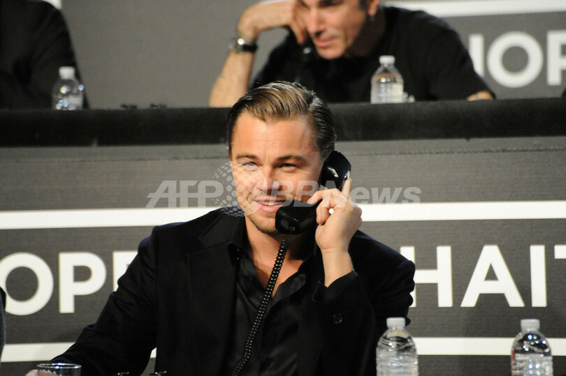 ハイチ大地震で被災した人たちの支援を目的とする寄付金集めのためのテレビ番組「ホープ・フォー・ハイチ・ナウ(Hope For Haiti Now)」が22日、米音楽情報チャンネルMTVで生放送された。俳優ジョージ・クルーニー(George Clooney)が司会を務め、多くのスターが電話で募金を受け付けた。写真は、電話を受ける俳優レオナルド・ディカプリオ(Leonardo DiCaprio、2010年1月22日撮影)。(c)AFP/MTV Hope for Haiti Now via Getty Images/Jeff Kravitz