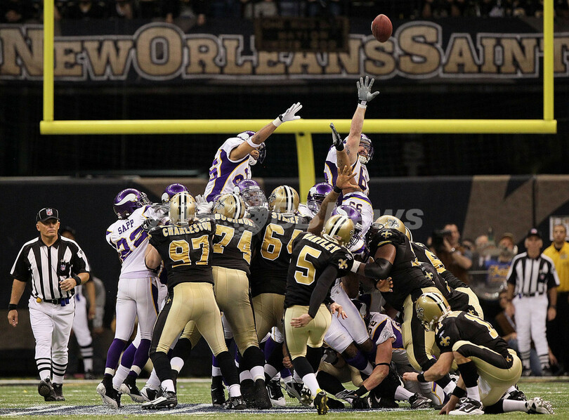 【1月25日 AFP】09NFLプレーオフ、ナショナル・カンファレンス(NFC)決勝、ニューオーリンズ・セインツ(New Orleans Saints)対ミネソタ・バイキングス(Minnesota Vikings)。試合は28-28の同点で迎えたオーバータイム(OT)にギャレット・ハートリー(Garrett Hartley)が40ヤードのフィールドゴールを決めたセインツが31-28で勝利し、チーム創設以来初のスーパーボウル進出を決めた。