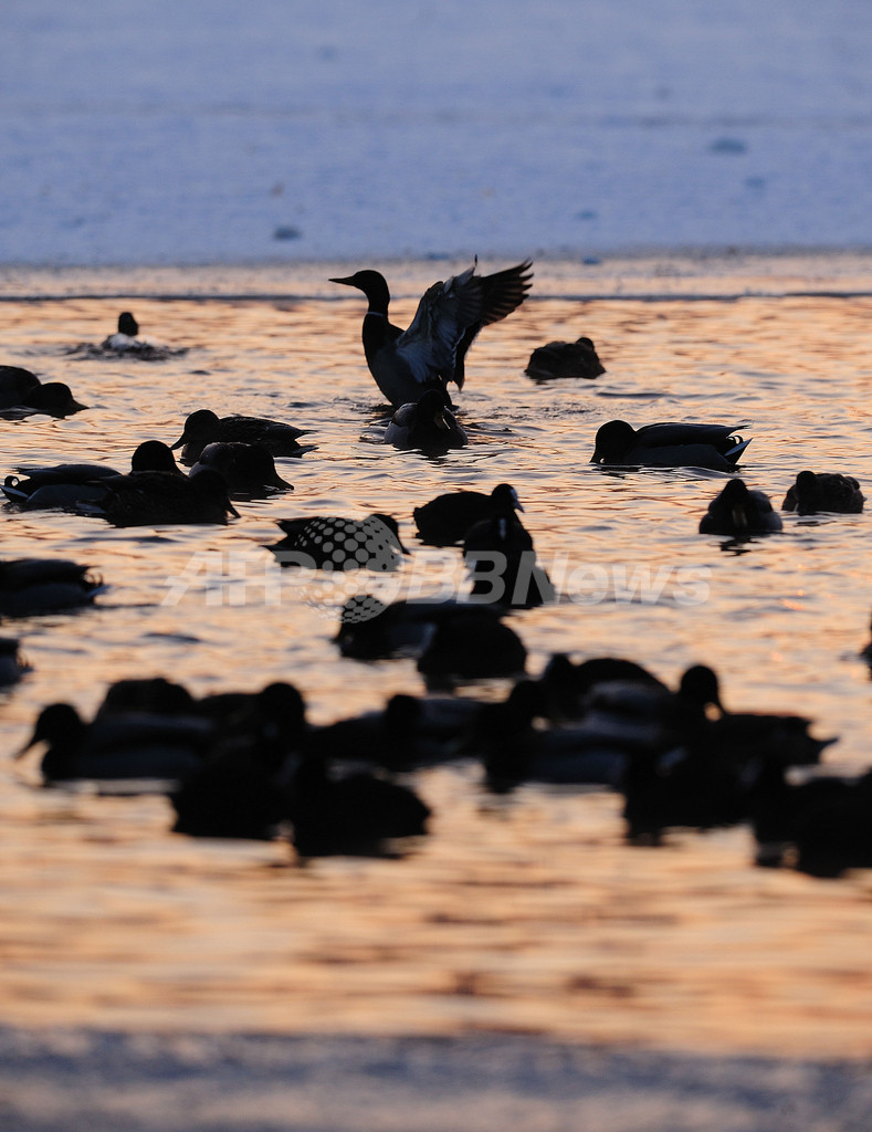 写真は、ブカレストのアレクサンドル・ヨアン・クザ(Alexandru Ioan Cuza)公園で、湖のまだ凍結していない場所に集まる水鳥(2010年1月24日撮影)。(c)AFP/DANIEL MIHAILESCU