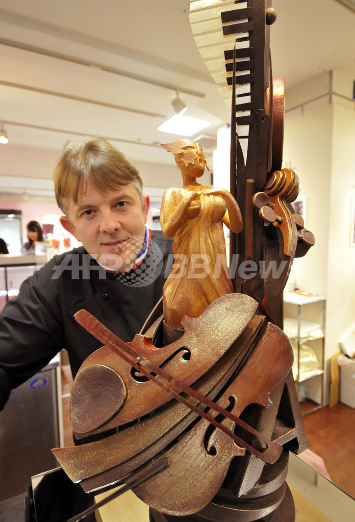 写真は、オープニングイベントで、オペラをテーマにしたチョコレート彫刻を披露する仏人ショコラティエ、ステファン・トレアン(Stephane Treand)氏(2010年1月26日撮影)。(c)AFP/Yoshikazu TSUNO