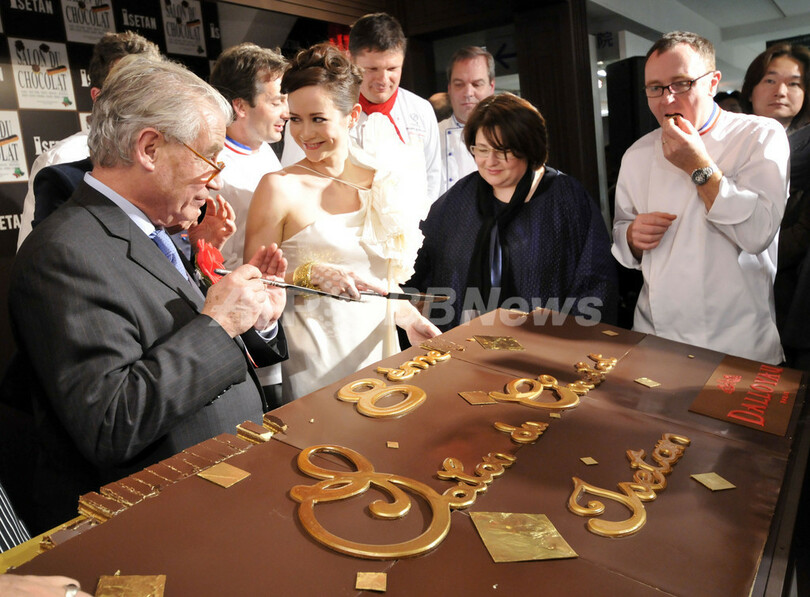 写真は、オープニングイベントで、仏ブランド「ダロワイヨ(Dalloyau)」製の巨大チョコレートケーキ「オペラ(opera)」を切り分ける仏人ショコラティエら(2010年1月26日撮影)。(c)AFP/Yoshikazu TSUNO