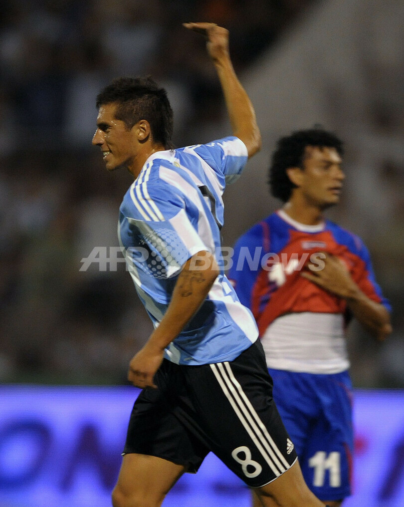 サッカー国際親善試合アルゼンチン対コスタリカ。試合はアルゼンチンが3-2で勝利した。写真は前半10分に先制点を決めて喜ぶアルゼンチンのホセ・エルネスト・ソサ(%%Jose Ernesto Sosa%%、左)。(2010年1月26日撮影)(c)AFP/ALEJANDRO PAGNI