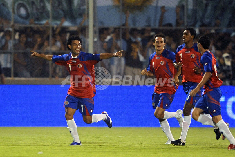 サッカー国際親善試合アルゼンチン対コスタリカ。試合はアルゼンチンが3-2で勝利した。写真は前半21分に得点を決めて歓喜するコスタリカのミカエル・バランテス(%%Michael Barrantes%%、左)(2010年1月26日撮影)(c)AFP/ALEJANDRO PAGNI
