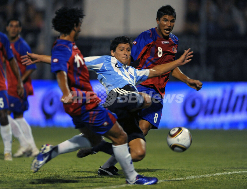 サッカー国際親善試合アルゼンチン対コスタリカ。試合はアルゼンチンが3-2で勝利した。写真は前半38分にチームの2点目を決めるアルゼンチンのギジェルモ・ブルディッソ(%%Guillermo Burdisso%%、中央)。(2010年1月26日撮影)(c)AFP/ALEJANDRO PAGNI