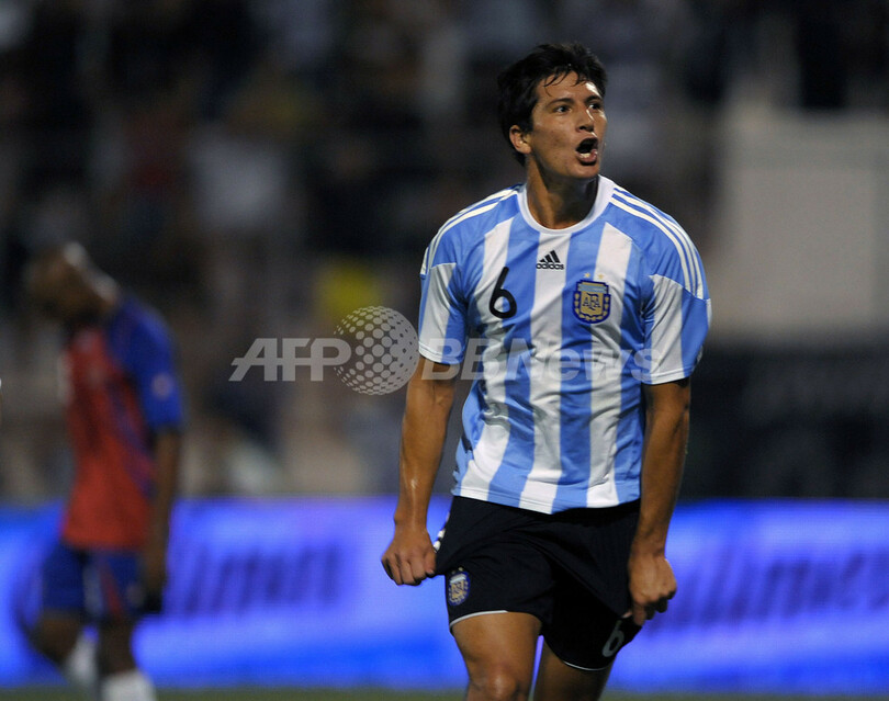 サッカー国際親善試合アルゼンチン対コスタリカ。試合はアルゼンチンが3-2で勝利した。写真は前半38分にチームの2点目を決めて喜ぶアルゼンチンのギジェルモ・ブルディッソ(%%Guillermo Burdisso%%)。(2010年1月26日撮影)(c)AFP/ALEJANDRO PAGNI