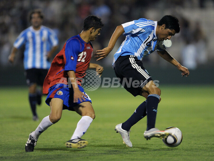 サッカー国際親善試合アルゼンチン対コスタリカ。試合はアルゼンチンが3-2で勝利した。写真はコスタリカのクリスティアン・ガンボア(%%Cristian Gamboa%%)の前でボールをコントロールするアルゼンチンのエストゥディアンテスのエンソ・ペレス(%%Enzo Perez%%、右)。(2010年1月26日撮影)(c)AFP/ALEJANDRO PAGNI