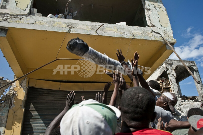 写真は、ポルトープランスで、地震で大破した建物から集まった群衆に物資を投げ渡す略奪者ら(2010年1月27日撮影)。(c)AFP/FRED DUFOUR