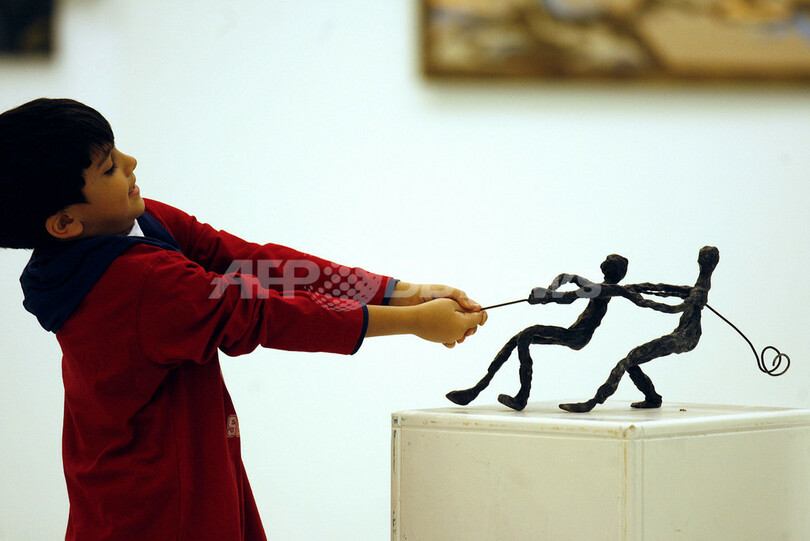 【1月28日 AFP】写真はクウェートの首都クウェート市(Kuwait City)のアル・アドワニ芸術ホール(Al-Adwani Art Hall)で展示されている同国のアーティスト、ファデル・アッバール(Fadhel al-Abbar)さんのブロンズ像作品「綱引き(Tug of War)」と遊ぶ少年。展覧会は湾岸諸国で開催される文化イベント、「アルクレイン・カルチャー・フェスティバル(Al-Qurain Cultural Festival)」の一環で開かれている。 (c)AFP