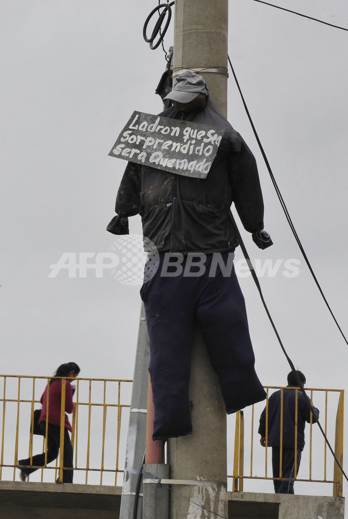 ニュース 社会 街角に犯罪者の指名手配人形、住民による私刑が増加 南米ボリビア 2010年1月29日 18:28 発信地:エルアルト/ボリビア [ 中南米 ボリビア ] このニュースをシェア ‹ › ❮ 12/14 ❯ 南米ボリビア・ラパス(La Paz)近郊の街エルアルト(El Alto)では、多発する犯罪に対する警察の不手際に業を煮やした住民らが、自らの手で犯人に私刑を加える例が増えている。非公式統計によると、2009年には強盗事件の犯人と疑われた15人以上が、住民によって絞首や火をつけられるなどしたという。 写真は、エルアルトの通りに吊るされた犯罪事件容疑者の人形。プラカードには「住民の皆さんへ。この容疑者を見つけたら、近隣住民全員に秘密電話で通報してください」と書かれている(2010年1月14日撮影)。(c)AFP/Aizar Raldes 画像作成中 ! 【1月29日 AFP】南米ボリビア・ラパス(La Paz)近郊の街エルアルト(El Alto)では、多発する犯罪に対する警察の不手際に業を煮やした住民らが、自らの手で犯人に私刑を加える例が増えている。非公式統計によると、2009年には強盗事件の犯人と疑われた15人以上が、住民によって絞首や火をつけられるなどしているという。(c)AFP 社会 一覧へ> メディア・報道関係・法人の方向け 写真・動画 購入のお問合せ>